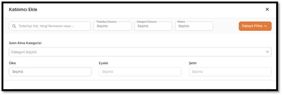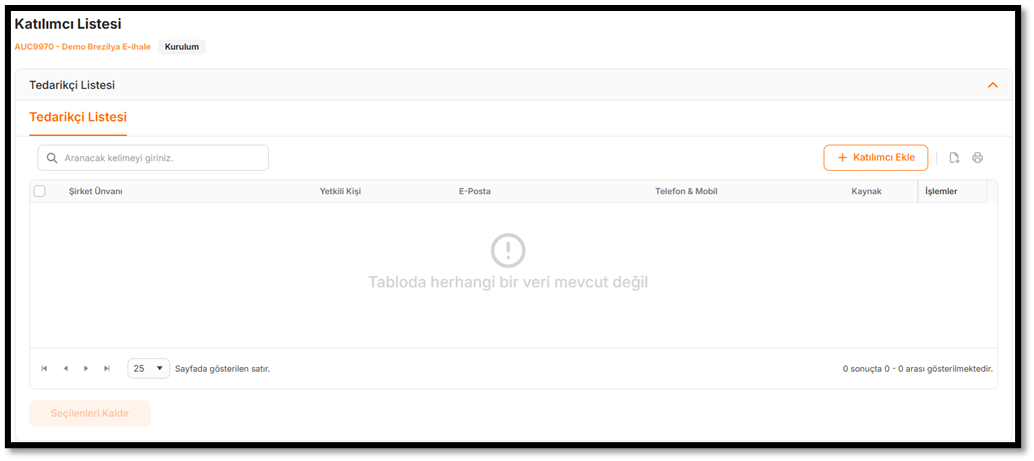 Tedarikçileri sürece davet etmek için Katılımcı Ekle butonu tıklanmalıdır.