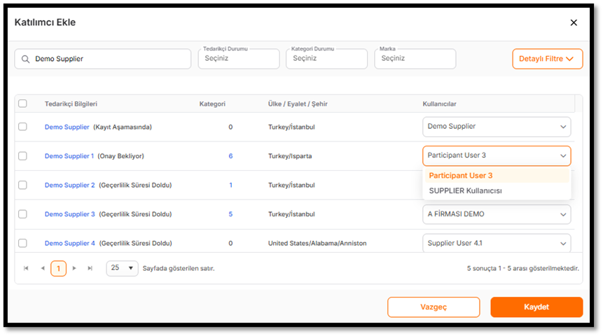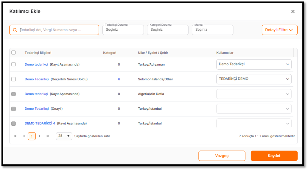 Belirlediğiniz tedarikçiyi sürece eklemek için, ilgili tedarikçiyi satırbaşındaki kutucuğa tıklayarak seçmeniz ve Kullanıcılar kolonundan sürece davet edilecek tedarikçi kullanıcısının kontrolünü sağlayabilirsiniz.