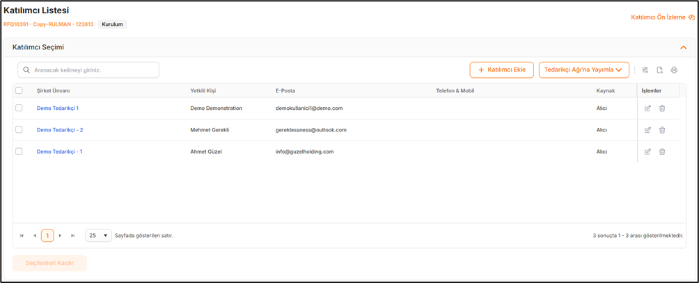 Dördüncü adım olan “Katılımcı Listesi” sekmesi, RFQ sürecine katılması istenilen firmaların belirlenebileceği bölümdür. Bu sekmede, sürece dahil edilmesi planlanan firmalar listeye eklenebilir. Ayrıca, tedarikçilerden önceden alınmış teklifler mevcutsa, bu teklifler ön teklif olarak sistemde tanımlanabilir ve kaydedilebilir. Ayrıca sayfada bulunan listenin “İşlemler” kolonundan katılımcı firmanın kullanıcıları arasından RFQye katılacak yetkili kişi için düzenleme işlemi yapılabilir ve hatalı eklenmiş olan katılımcı firmalar listeden kaldırılabilir. Listede istenilen katılımcıların satırlarında yer alan kutucuklar işaretlenerek “Seçilenleri Kaldır” butonuna basılarak toplu silme işlemi de yapılabilmektedir.