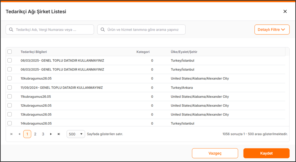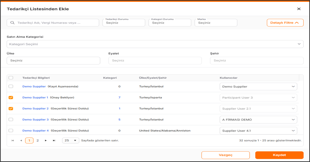 Daha kapsamlı bir filtreleme yapmak için “Detaylı Filtre” butonuna tıklanabilir. Bu seçenek, satın alma kategorisi, ülke, eyalet ve şehir bilgilerine göre listeyi daraltarak arama sonuçlarının daha spesifik hale getirilmesini sağlar.