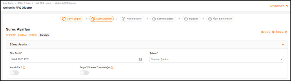 İkinci adım olan Süreç Ayarları sekmesine gelindiğinde, Kurulum durumunda olan Gelişmiş RFQ sürecine ayarların belirlenmesi gerekir. Bu sekme, RFQ’nun doğru ve etkili bir şekilde ilerlemesi için gerekli yapılandırmaların yapıldığı bölümdür.