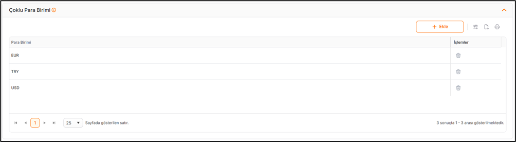 Bu alanda süreçte kullanılabilecek para birimleri eklenebilir. Bu alana para birimi eklenmediği takdirde katılımcılar tüm tanımlı para birimleri üzerinden tekliflerini iletebilirler.