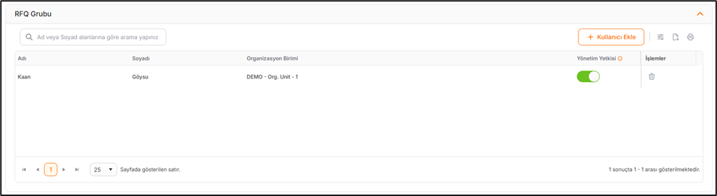 Bu alanda, normalde ilgili süreci görüntüleyemeyecek farklı organizasyon birimlerinden kullanıcılar için görüntüleme yetkisi tanımlanabilir. İstenirse, süreci yönetebilmeleri için “Yönetim Yetkisi” sütunundan yetki de verilebilir.