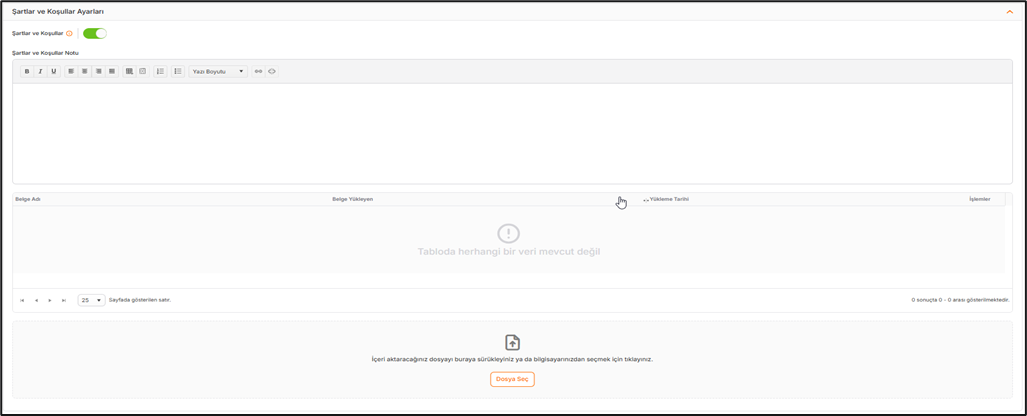 Bu alanda, katılımcıların ilgili sürece katılabilmeleri için kabul etmeleri zorunlu olan şartlar ve koşullar tanımlanabilir. Şartlar ve koşullar belirlenmek isteniyorsa, ilgili alan etkinleştirildikten sonra bir not eklenir. Ayrıca, istenirse katılımcıların şartları ve koşulları kabul ederken görüntüleyebileceği belgeler de bu alana eklenebilir.