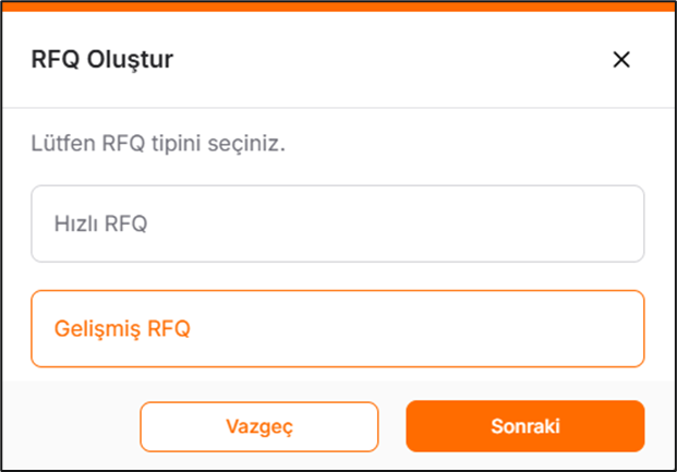 Ardından RFQ tipinde Gelişmiş RFQ seçilir.