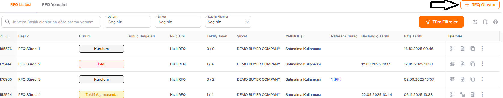 Sıfırdan Gelişmiş RFQ Süreci Oluşturmak için; RFQ/E-İhale ana başlığı altında yer alan RFQ başlığı ardından RFQ Listesi başlığı tıklanır. Açılan sayfada sağ üst kısımda yer alan RFQ oluştur butonu tıklanmalıdır.