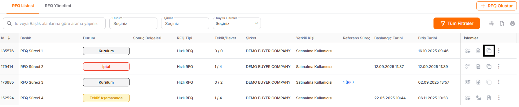 Kopyalayarak Süreç Oluşturmak için; RFQ Listesi başlığı tıklanarak Süreç listesi görüntülenir. Kopyalanmak istenen süreç için işlem kolonunda yer alan "Kopyala" aksiyonu tıklanır.