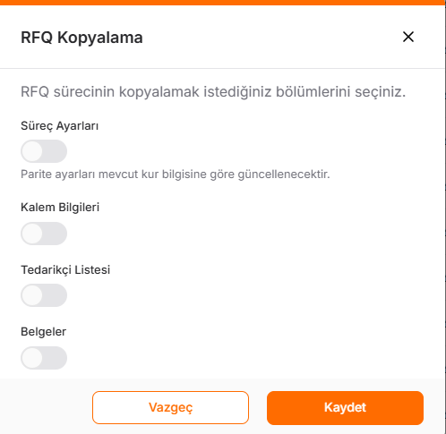 Açılır sayfada kopyalamak istediğiniz RFQ’da Kalem Listesi, Tedarikçi Listesi ve Belgeler sayfalarından yeni sürece taşımak istediğiniz alanları aktif hale getirerek sadece istediğiniz RFQ sayfalarını kopyalayabilirsiniz. Tüm durumlarda süreçler kopyalanabilir.