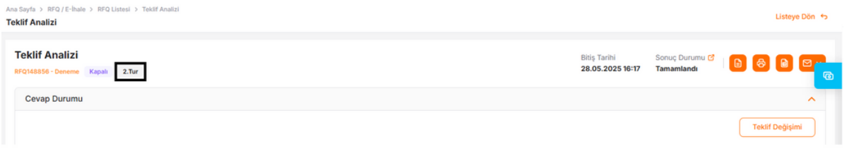 Hızlı RFQ sürecinin teklif analizi sayfasında süreç aşamasının yanında sürecin tur sayıları görünür.