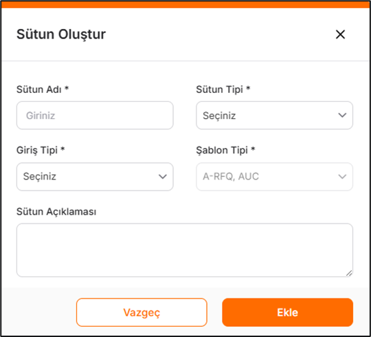 Sayfanın sağ üst köşesinde yer alan “Sütun Ekle” butonuna tıklandığında, şablonlarda kullanılmak üzere yeni bir sütun oluşturabileceğiniz pencere açılır. Zorunlu alanlar doldurulup “Ekle” butonuna basıldığında sütun oluşturulur ve liste sayfasında görüntülenebilir.