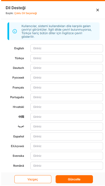 Açılan dil desteği penceresinde, istediğiniz metnin çevirilerini ekleyebilir ve Güncelle butonuna tıklayarak kaydedebilirsiniz.