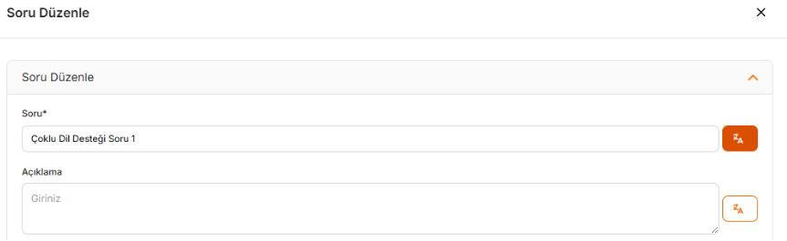 Kaydet ve Devam Et butonuna tıklandıktan sonra Soru ve açıklama alanın yanında çoklu dil desteği butonu ile çeviri girilip güncelleme butonuna basıldığında soruya karşılık gelecek çeviri eklenmiş olacaktır.