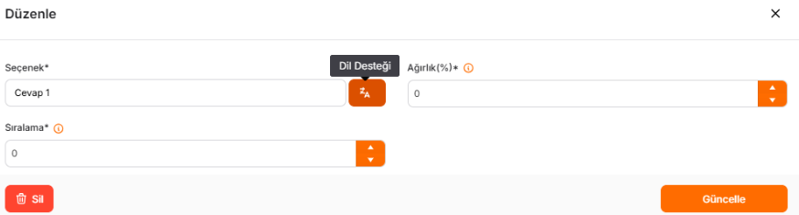 Kaydet butonuna tıklandıktan sonra cevap alanın yanında çoklu dil desteği butonu ile çeviri girilip güncelleme butonuna basıldığında soruya karşılık gelecek çeviri eklenmiş olacaktır.