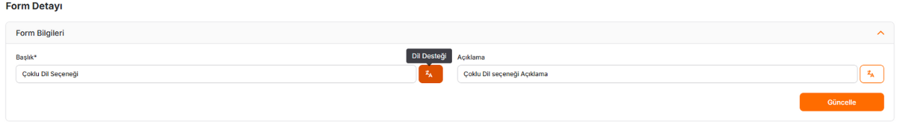Formu kaydettiğinizde Başlık ve Açıklama alanlarının yanına Dil Desteği butonu açılacaktır. Dil desteği Butonu tıklanır.